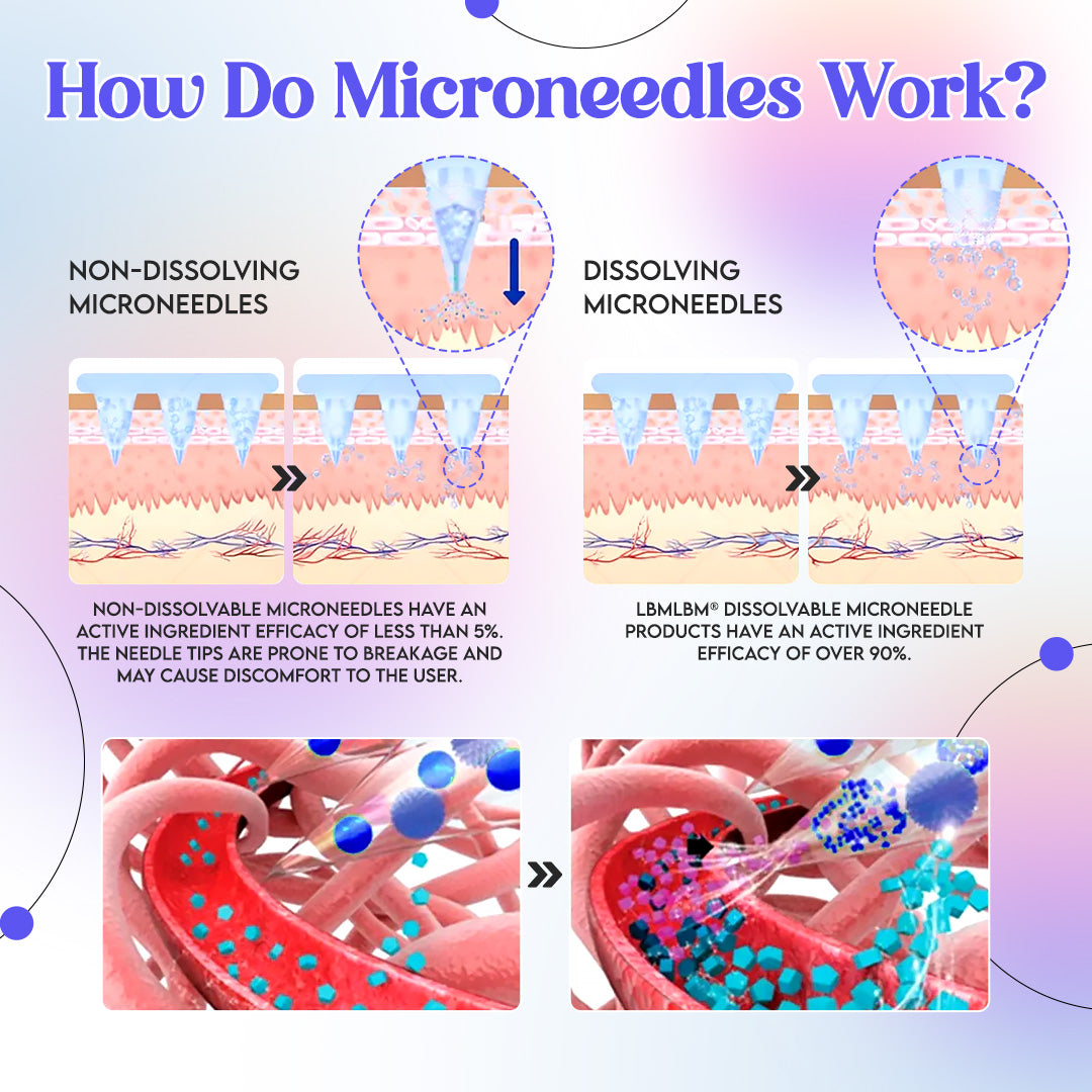 Each needle is 0.27mm long. just 1/7th the thickness of a hair. and is made from dissolvable medication. These micro-needles are precision-engineered using cutting-edge manufacturing techniques to ensure a seamless. pain-free experience while effectively delivering the active ingredients directly into the skin.